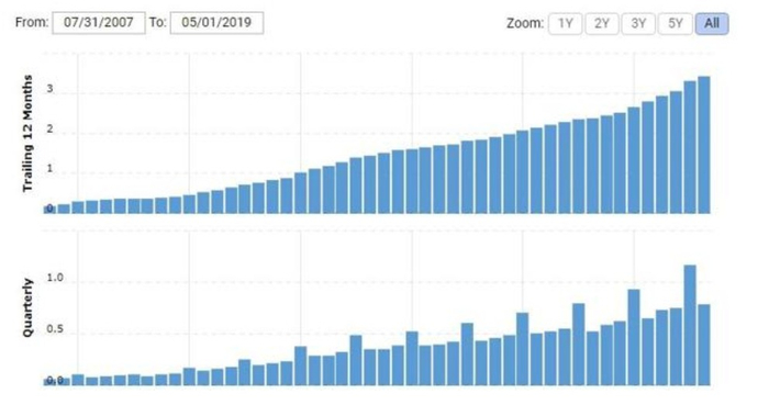 应该没有哪一间公司像露露柠檬一样,总是能给投资者带来惊喜。在过去的12年当中,公司的季度收入有增无减。