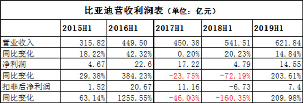 根据比亚迪2019年半年报,今年上半年,比亚迪营收为621.84亿元,同比增长14.84%;净利润14.55亿元,同比增长203.61%;扣非后净利润7.40亿元,同比增长209.98%,而去年同期扣非后净亏损6.73亿元。