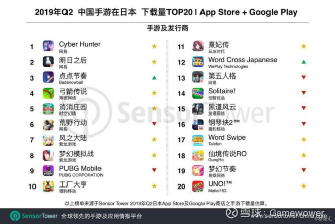 同样是Sensor Tower的数据,2019年Q2中国手游在日本收入Top20的产品中,网易4款入围,《荒野行动》第一、《第五人格》第八、《明日之后》和《率土之滨》日服(大三国志)分别为第十五、十七。