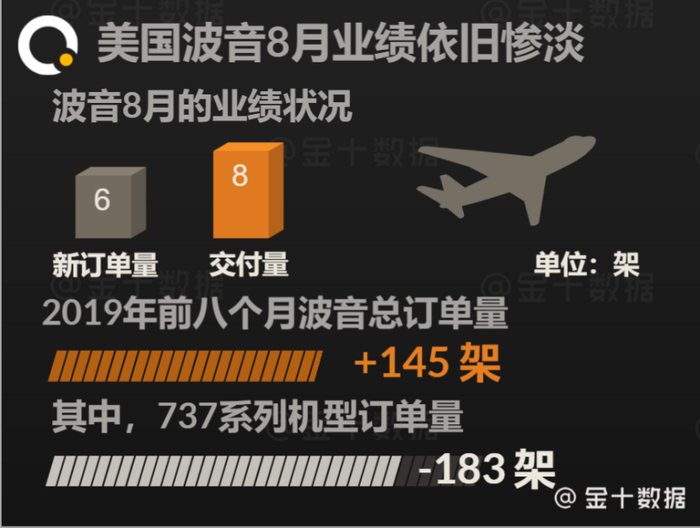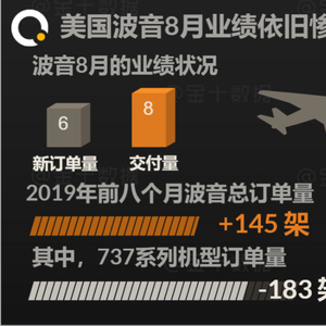 波音737 MAX事故负面影响持续发酵。据波音公布的数据显示,8月,波音一共收到6个的商用飞机订单,较去年同期骤降近94%;客机订单交付量为18架,降幅达72%。受737系列机型退单183架的拖累,2019年前八个月,波音商用飞机总订单量为145架。