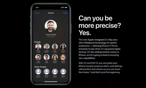 苹果公司表示,这将增强AirDrop功能,该功能可以让iPhone用户与附近的iPhone用户快速共享文件。从9月30日iOS 13.1系统开始,新的芯片将允许iPhone指向其他特定的iPhone,AirDrop将优先处理该设备,这样你就可以更快地共享文件。