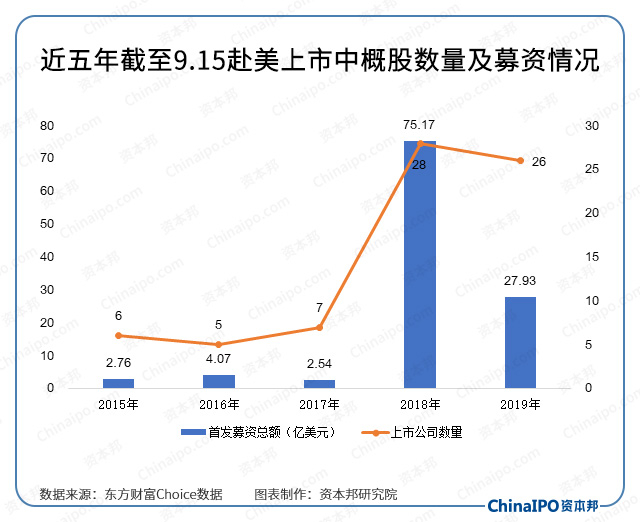 2019年至今,至少有26只中概股在美股成功上市,比去年同期减少2家,募资总额则较上年同期下滑了62.84%。