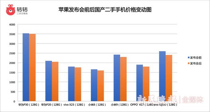 而在苹果发布会后,国产手机在二手市场依然保持下降趋势。转转手机行情显示,二手国产手机的主力机型价格目前降幅大多维持在100元左右。比如二手小米8的成交均价就由1658元降至1599元,而vivo X23和OPPO R17分别降价50-100元不等。