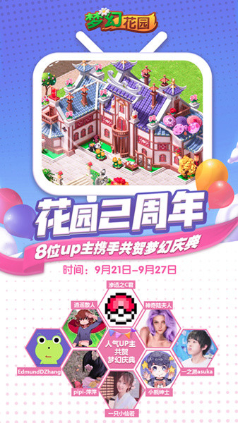 周年庆期间,《梦幻花园》邀请了B站8位up主:逍遥散人、渗透之C君、EdmundDZhang、神奇陆夫人、小熊绅士、一之濑asuka、一只小仙若、pipi-萍萍线上线下联动,齐贺花园2周年盛典。21日起,连续3日晚上直播狂欢,看up主上头现场;更有up主惊现线下快闪,舞动山城,线上线下直播互动。Pick你喜欢的up主,离花园周年庆典更近一步吧!