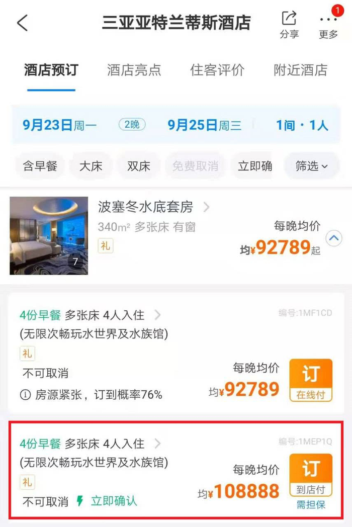 其中,最著名的波塞冬水底套房,携程网最新数据显示,该客房标准价格为108888元/晚,也是到店付的价格,在线提前支付的价格为92789元/晚,340平米,最多四个人入主。这个房间的介绍中,有这样一句话:客人可以与鲨鱼共眠。