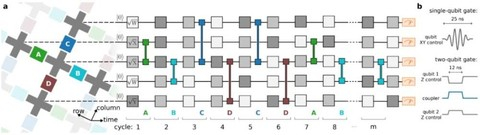 图 3:量子霸权电路的控制操作。a. 实验中使用的量子电路示例;b. 单量子比特和双量子比特门的控制信号波形图。