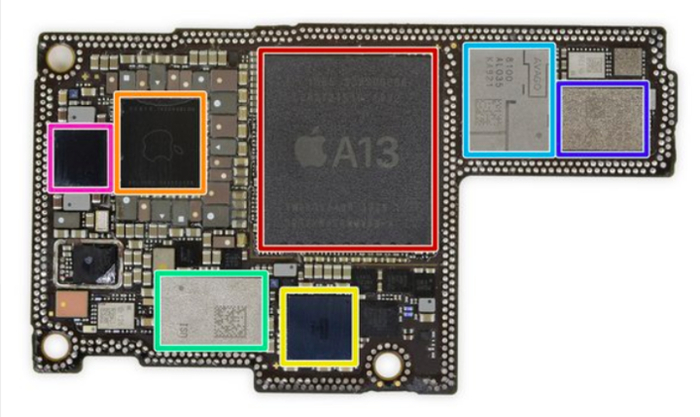 红:从 SK Hynix H9HKNNNCRMMVDR-NEH LPDDR4X 上分层的 Apple APL1W85 A13 仿生 SoC橙:苹果 APL1092 343S00355 PMIC黄:Cirrus Logic 338S00509 音频编解码器绿:可能是 U1 超宽带芯片浅蓝:Avago 8100 中高频段 PAMiD深蓝:Skyworks 78221-17 低频段 PAMiD粉:STMicrolectronics STB601A0N 电源管理 IC