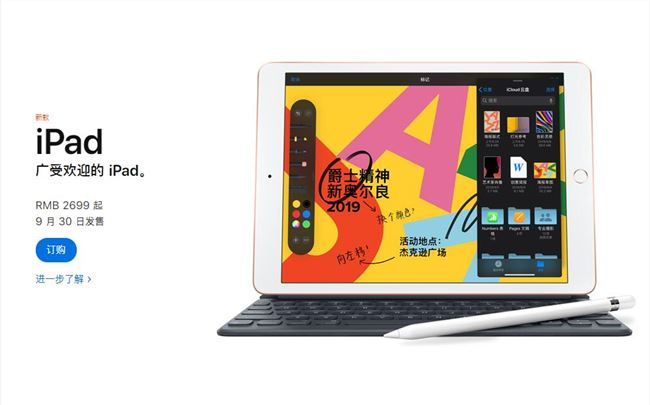目前苹果中国官网显示 10.2 英寸第七代 iPad 已经开启预购,将于 9 月 30 日发售,起售价格 2699 元 (32GB)。