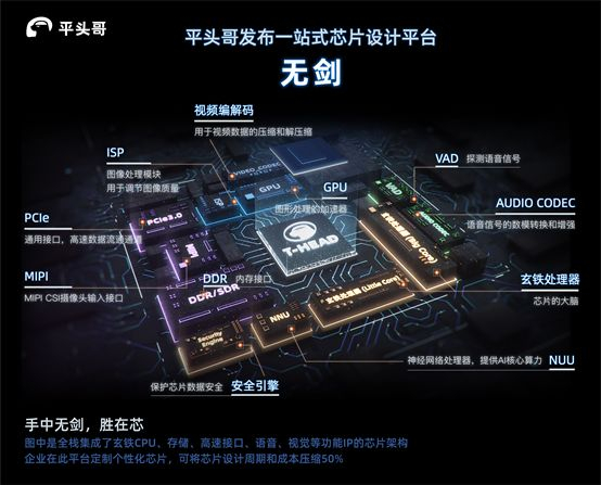 “无剑”SoC芯片平台则是面向AIoT时代的一站式芯片设计平台,提供集芯片架构、基础软件、算法与开发工具于一体的整体解决方案,能够帮助芯片设计企业将设计成本降低50%,设计周期压缩50%。