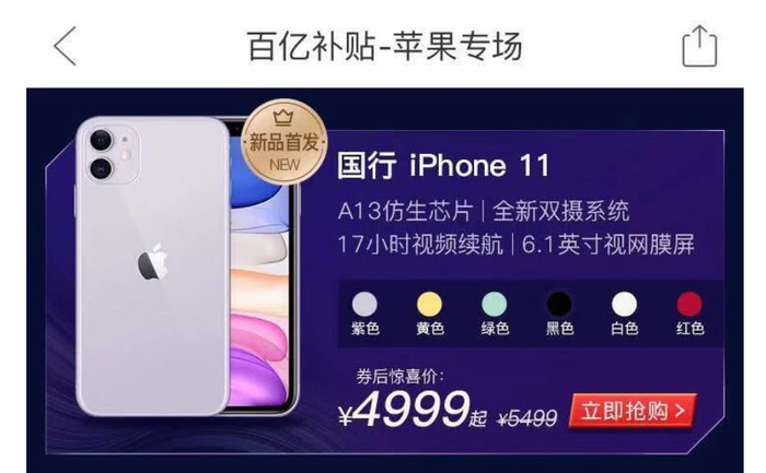 9月20日,在苹果新产品发售后,拼多多启动了全网最大力度的补贴计划,针对新款手机给予了500元-900元的补贴优惠。拼多多上的iPhone11、iPhone11Pro和iPhone11Pro Max券后起售价分别为4999元、7999元和8699元,均创下新款iPhone全网最低发售价。