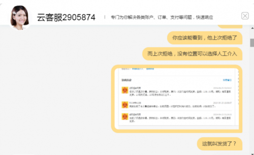 另外,系统提示称,“若卖家拒绝了退款您也可以点击退款页面上的【客服介入】,小蜜会马不停蹄召唤人工小二给您处理~” 。对此,赵先生告诉财经网,在卖家第一次拒绝其退款申请时,他并未找到可以“申请人工小二介入”的按钮。