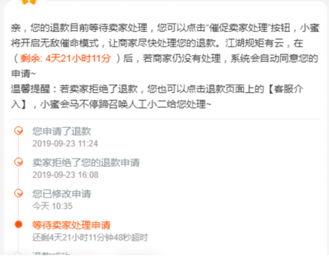 赵先生称,自己又等了两天,直到25日联系卖家时,对方一直以“售后晚点处理”为由回复它,却迟迟没有作出处理。赵先生告诉财经网,由于自己没有找到可以联系淘宝客服处理的按钮,没有小二出面协调或者帮忙仲裁,在无奈之下只好选择了修改申请,却发现等待卖家处理需再等待4天21小时。