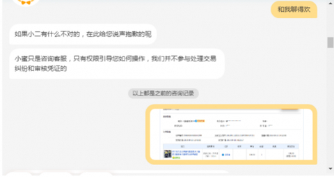 不仅如此,小蜜客服还表示,“小蜜只是咨询客服,只有全县引导如何操作,并不参与处理交易纠纷和审核凭证。”