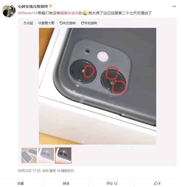 9月25日消息,首批iPhone 11系列用户使用新机才没几天时间,但是发现的问题已经不少了,比如正在慢慢爆发的“进灰门”。据首批拿到iPhone 11系列的网友陆续反馈,新机的摄像头很容易进灰,怀疑是品控问题。还有网友表示,刚买的iPhone 11开箱后发现镜头有灰尘,目前用户已经将这些情况反馈给苹果,后者的客服表示正在调查中。