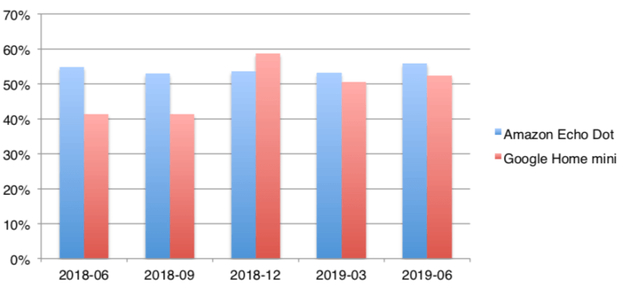 在美国市场销售的智能音箱中,超过半数的销售额都是来自于低端产品,这个市场是亚马逊Echo Dot和谷歌Home Mini的激烈厮杀阵地。而在人工智能和云服务领域,这两大巨头也是最直接的竞争对手。Loup Ventures此前预计,谷歌的智能音箱可能会在2021年超过亚马逊的Echo。