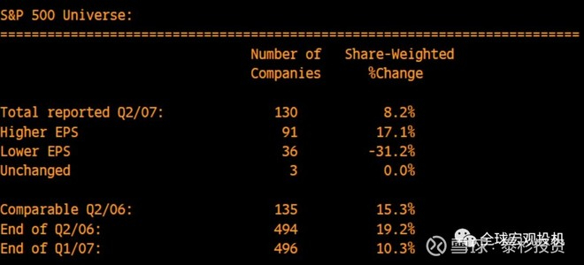 美股总体盈利增长8.2%,但是相比2006Q2 15.3%的增速已经大幅降低。
