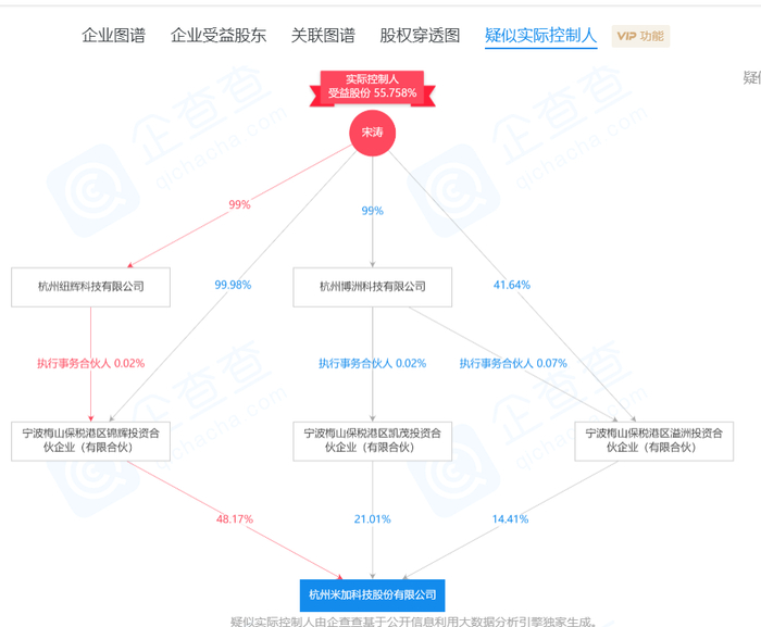 2018年,米加科技基本完成VIE结构的拆除。企查查数据显示,当前的股东结构中,董事长宋涛共计持有55.758%的股份,为米加科技的实际控制人。