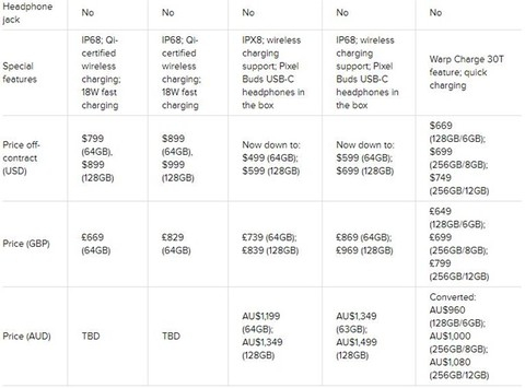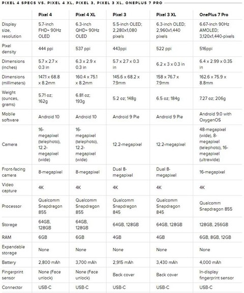 以下是Pixel 4、Pixel 4 XL、Pixel 3、Pixel 3 XL、OnePlus 7 Pro的具体参数对比: