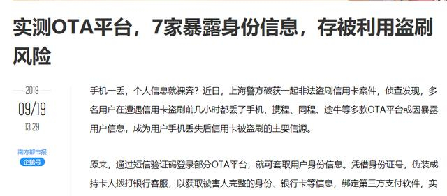 9月初,上海警方破获一起非法盗刷信用卡案件,侦查发现,多名用户在遭遇信用卡盗刷前几小时都丢了手机,途牛等多款OTA平台或因暴露用户信息,成为用户手机丢失后信用卡被盗刷的主要信源。