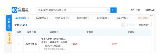 企查查数据显示,4月19日,途牛(南京)信息技术有限公司进行工商信息变更,法定代表人、执行董事、总经理职务由途牛旅游网联合创始人、CEO于敦德变更为途牛旅游网副总裁陈杰。途牛信息为途牛上市公司旗下子公司——途牛旅游(香港)有限公司全资子公司,成立于2011年8月,注册资本10亿元人民币。