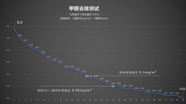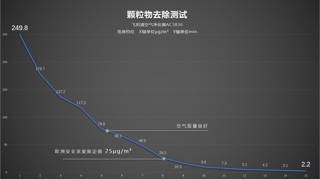 后期曲线逐渐趋于平缓。去除效率位于市场第一梯队,已经远小于飞利浦对自己要求的期望值10μg/m3,比欧洲标准低10余倍。