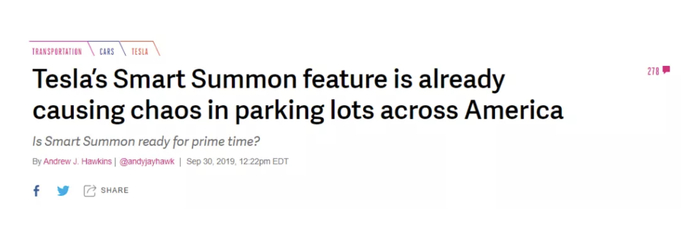 紧接着,美国科技媒体 The Verge 发表了一篇名为《特斯拉的增强召唤功能正在全美停车场搞事情》的报道: