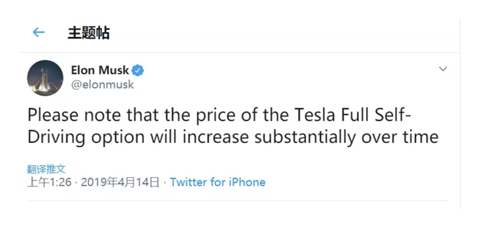 时间再往回推,发布 FSD 芯片和 Autopilot 硬件 3.0 之前,马斯克在 4 月 14 日发了一条这样的推特:「请大家注意,特斯拉 FSD 功能选装价格将会随着时间的推移而不断上升」。
