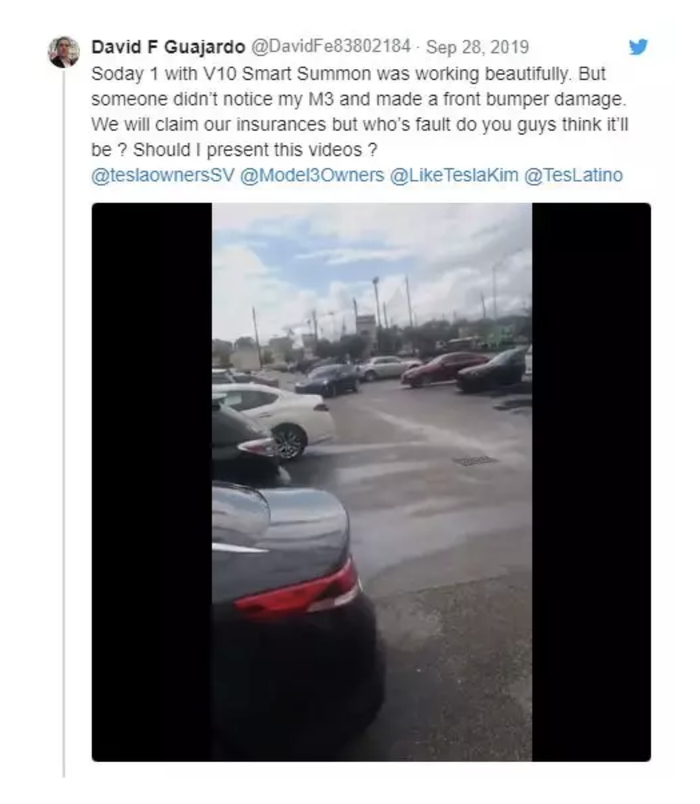 另一位网友@David F Guajardo 就没有这么幸运了,他的 Model 3 保险杠在使用增强召唤的时候被撞了个结结实实: