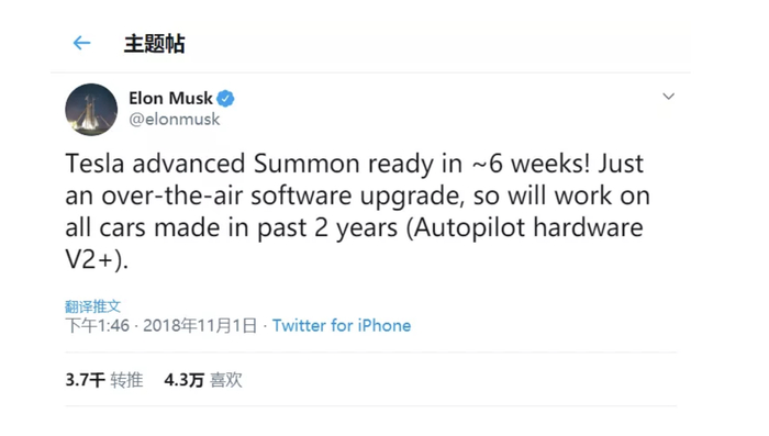 作为这次涨价的「元凶」,Smart Summon 增强召唤功能最近一年来,一直处于舆论的风口浪尖。 2018 年 11 月 1 日,马斯克在推特上第一次预告了增强召唤的发布日期:6 周内。