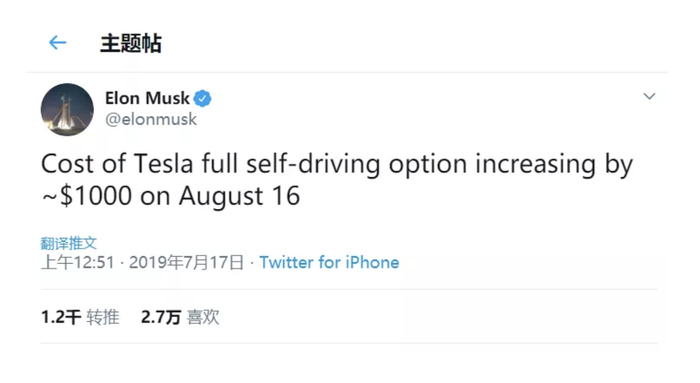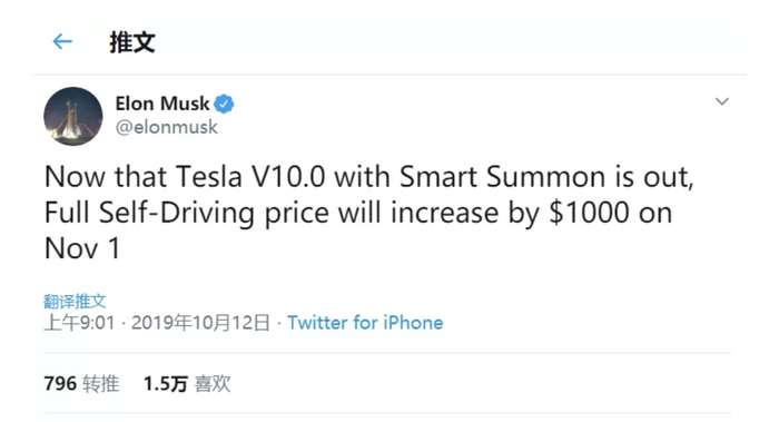 12 号,马斯克在推特上这么说:「基于搭载增强召唤功能的 V10 系统已经发布,从下个月 1 号开始,FSD 全自动驾驶功能选装价格将会上涨 1000 美元」。