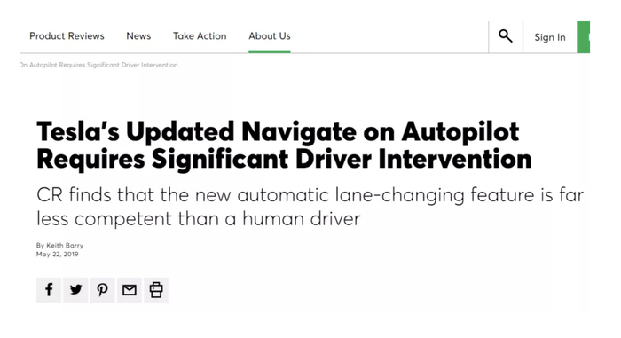 早在去年,Navigate on Autopilot 伴随着 V9 版本系统全球推送的时候,《消费者报告》就曾经对特斯拉激进的软件策略表示过反对。当时的标题叫做《特斯拉新的 Navigate on Autopilot 功能更加需要驾驶员干预》。