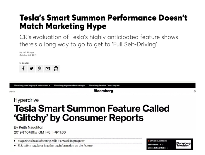 10 月 8 号,和特斯拉结过好几次梁子的美国《消费者报告》发表了一篇文章,题目是《特斯拉增强召唤的表现比不上他们的市场炒作》。「hype(大肆炒作)」这个单词用于标题是很严重的事情,于是彭博社、路透社、Engadget 一众大型财经/科技媒体纷纷转发。