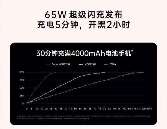 65W超级闪充:5G相比于4G拥有几十倍的速度提升,高收益自然也带来了更高的功耗。而除了增大电池容量以外,让电池迅速充满无疑成为解决续航问题最具性价比的手段。65W超级闪充首发于OPPO Reno Ace,实测不到半个小时即可充满4000mAh电池。如此速度,不仅解决了续航问题,还在产品营销推广和用户使用印象上都有所裨益。