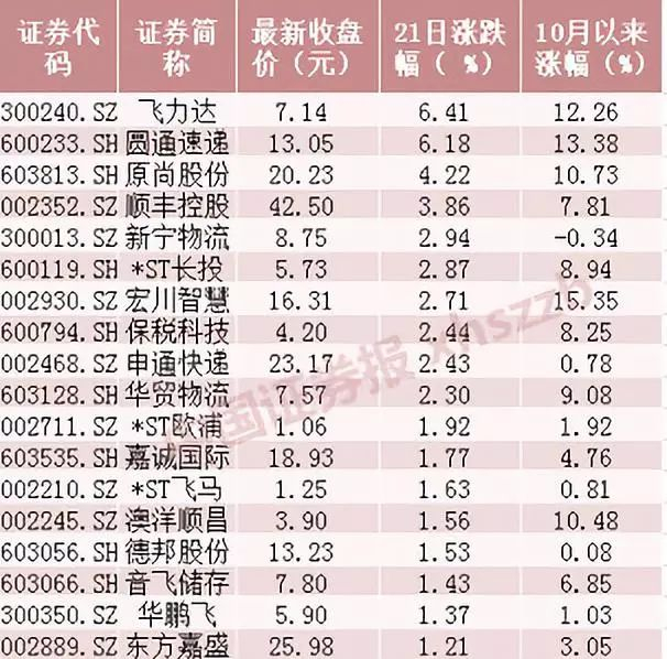10月以来涨幅居前物流股
