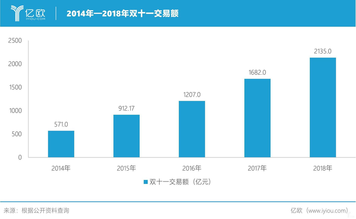 随着经济的不断发展,电商逐渐崛起,“双11”逐渐走向巅峰时期。据公开资料查询,2014年至2018年间天猫“双11”交易额增长了1564亿元。2018年“双11”交易额达2135亿元。