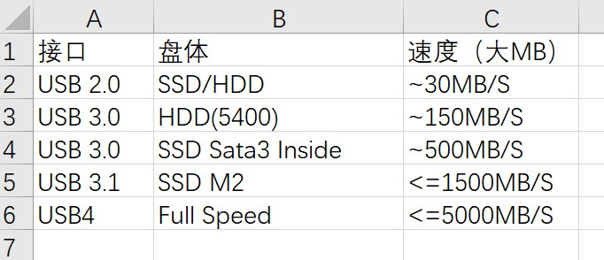 百度网盘会员和非会员的下载速度我们就不提了,超级会员极速下载能有多快呢?理论上跑满500M带宽是没问题的,也就是55MB/s。移动硬盘不涉及什么网络下载速度,我们用数据传输速度来代替。USB 3.0理论带宽是6Gbps,也就是750MB/s,如果是SSD(传统)大概是500MB/s,但是5400的HDD最快读取在150上下。具体我们还是看表格吧: