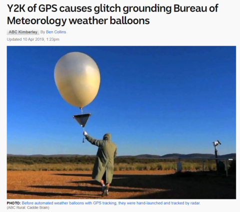 气象研究领域比较依赖GPS,发生周数翻转也会对相关设备造成严重影响。根据ABC新闻的报道,4月6日的这次GPS周数翻转就导致澳大利亚气象局(BOM)的气象气球停飞。