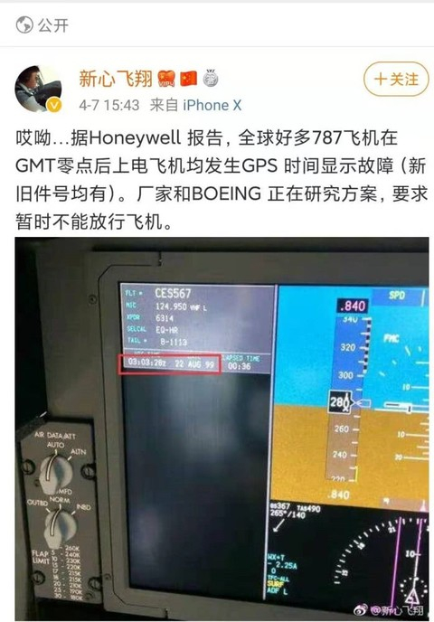 民航领域基本都是靠GPS进行授时的,所有自动化的设备都是以该时间来作为基准。周数翻转可能引发空管雷达信号数据混乱,会引起数据中断、目标航迹与计划不相关等问题。2019年4月7日,GPS周数翻转以后,就有多家航空公司的波音787飞机出现时间显示故障,暂时不能起飞。微博博主、航旅达人@新心飞翔还放出一张图片,从图片上看,飞机显示的时间变成了1999年。
