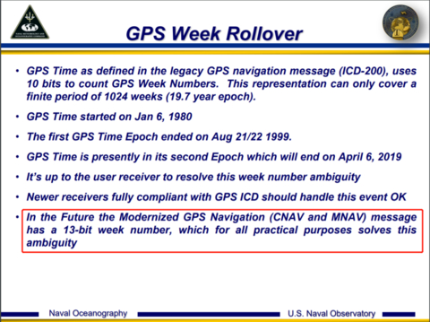 GPS以特定格式广播日期和时间信息,包括周计数(WN)和周内秒(TOW)。但是,WN字段的长度被限制为10位,它记录周数的范围则为0到1023,也就是说GPS信息最多可以记录1024周(19.7年),在1023周的末尾,WN又会从0开始,发生翻转(Rollover)。
