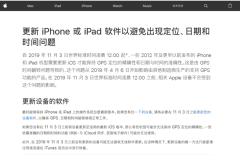 近日,苹果在官网发布公告,建议用户为部分iPhone和iPad更新系统。公告称,自2019年11月3日世界标准时间0:00起,一些2012年及更早以前发布的iPhone和iPad机型需要更新iOS才能保持GPS定位的精确性和日期与时间的准确性。