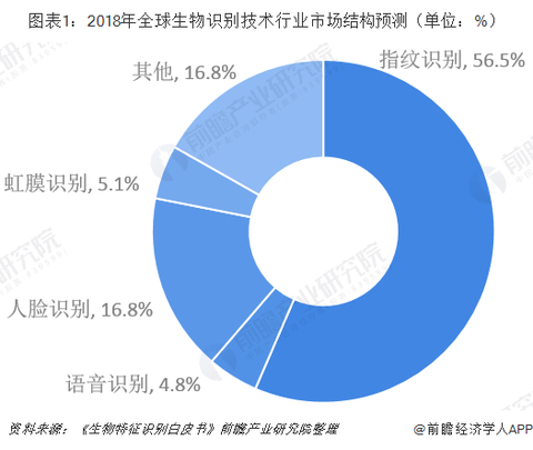 据中国电子技术标准化研究院公布的《生物特征识别白皮书》显示,指纹识别在生物识别技术中所占的份额最高,但整体呈下降趋势,由2007年的66.9%降至2018年的56.5%,预计到2023年将下降至50.8%左右;而人脸识别则增长迅速,2018年比重达16.8%。