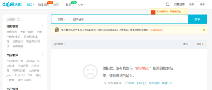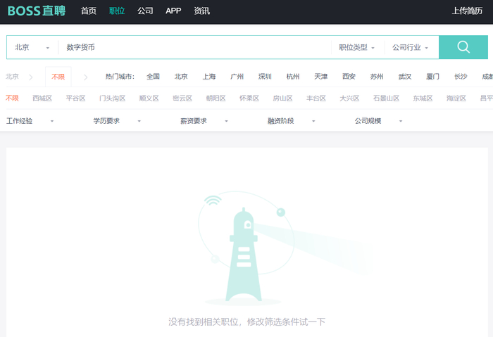 查看发现,目前BOSS直聘数字货币、虚拟货币等相关职位也已被下架。搜索关键词显示“没有找到相关职位,修改筛选条件试一下”。此外,另一招聘网站大街网也无法搜索到数字货币、虚拟货币相关岗位,显示没有找到相关搜索结果。