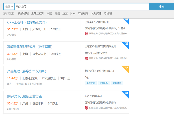 在前程无忧、猎聘等招聘网站搜索发现,数字货币、虚拟货币等关键词仍可以搜索到诸多相关职位,包括数字货币方向的工程师、研究员、数字货币交易所运营及产品经理等岗位。