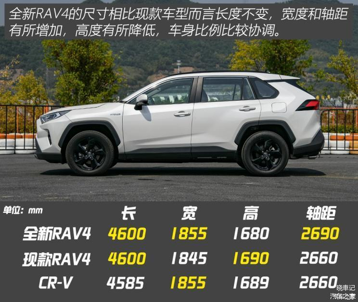 车身尺寸方面全系车型长宽高为4600/1855/1680mm,轴距为2690mm。2019款的RAV4荣放车型长宽高分别为4600/1845/1690mm,轴距为2660mm。与全新一代RAV4荣放相比其宽度、高度、轴距均有所变化,而最明显的就是轴距的加长。