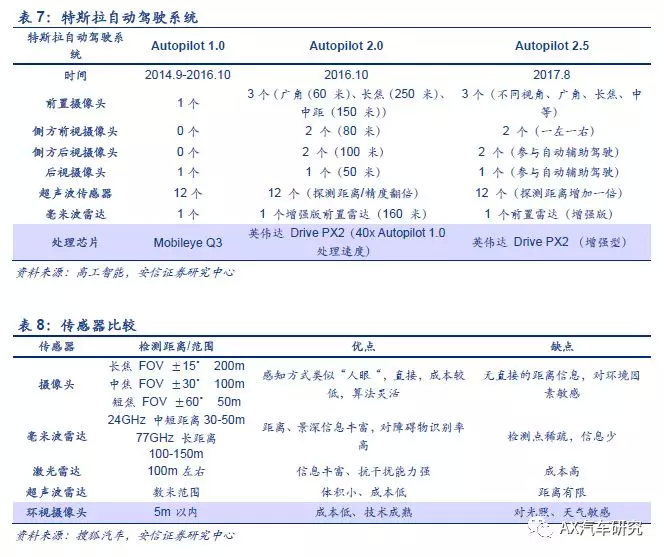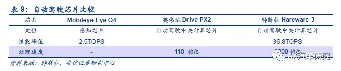 该芯片由芯片皇帝Jim Keller设计,处理速度是英伟达Drive PX2 芯片的21倍,是英伟达下一代自动驾驶芯片Drive Xavier的7倍。虽然Autopilot 2.0、2.5和3.0版本硬件采用类型和数量相同的传感器,但Autopilot 3.0硬件算力的提升使车辆能更高效地处理来自传感器的数据,这将让特斯拉的车型未来能够支持更高车速下的驾驶辅助或实现更多更全面的自动驾驶功能。特斯拉在由Mobileye和英伟达垄断的自动驾驶芯片中杀出一条血路,成为唯一一家具备自主研发自动驾驶芯片的车企。