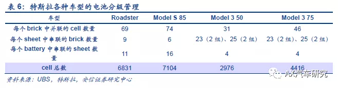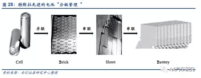 由于特斯拉使用的是18650和21700圆柱形电池,为保证能量密度和续航的要求,电池单体数量十分庞大,如何管理这个庞大的电池“家庭”是一个难题。公司采用了独特的“分级管理”方式把数量庞大的电池组中的每一块电池管理得十分到位。以Roadster为例,公司通过“cell→brick→sheet→battery”的分层实现了对6831节18650电池的管理。1)每69节cell并联成一个brick,2)每9组brick串联成一个sheet,3)每11个sheet串联成battery。在电池系统里,sheet是最小的更换单元。分层管理的串并联组合实现了对复杂繁多的电池组的有效管理,可以增加可铺设电池的数量,进而提高动力性能和续航里程。电池包平铺在车身下方,车身前后重量相差较小,提高安全性。