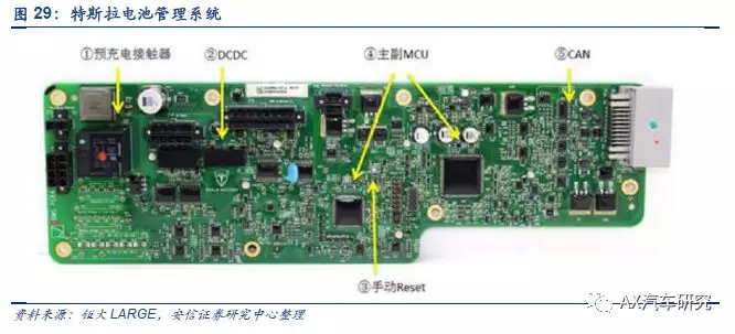 特斯拉的BMS采用主从架构,主控制器类似于“大脑“,主要负责高压、绝缘检测、高压互锁、接触器控制、对外部通信等功能,从控制器则负责单体电压、温度检测,并上报“大脑“。主控制器具备主副双微型单片机设计,设置双保险,副MCU可检测主MCU工作状态,一旦发现其失效可获取控制权限。而蔚来ES8的BMS电池管理系统相对简单,仅由BMU电池管理单元+N个CSC电芯监控控制器组成,具备SOC测量与估算、均衡策略、实时电池监控和实时预警等特性。
