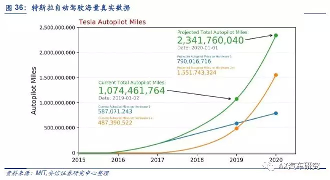 截至2018年底,特斯拉累计路测数据已经达到4.8亿英里,按照其公布的交付量、汽车平均行驶里程和AP启动状态下行驶里程估算,预计到2020年将突破15亿英里。按照马斯克的说法,特斯拉路测数据高达全行业总路测数据的99%。而自动驾驶领头羊的Waymo更多的是通过模拟测试获得数据,不仅数据量无法与特斯拉相提并论,而且数据的真实性和有效性也不如特斯拉。