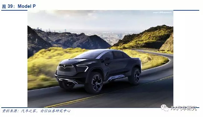:考虑到美国市场环境相对稳定成熟,皮卡市场2016-2018年增长率基本稳定在5%左右,预测其以3%的增速上涨。相对于竞品福特F150来说,Model P外型更科幻、续航里程高、拖拽力大,尤其是其低于5万美元的价格优势和极有可能配置的全自动驾驶更是力压福特F150的重点,据美国在全球进行的福特“神车”F150 PK特斯拉Model P的投票结果显示,福特败给了特斯拉皮卡。预计Model P赢面很大,将会抢占福特F150的部分市场,福特F系列在美国的市场份额常年保持在30%,我们预测2020-2021年Model P将会获得0.5%、2.0%的市场份额。