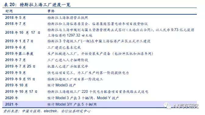 自2018年5月,特斯拉上海取得营业执照以来,特斯拉国产工厂就进入了加速模式。同年7月,特斯拉和上海临港委员会、临港集团签署电动车项目投资协议,以最低价拿下了浦东的1297亩工业用地。2019年1月工厂破土动工,6月工厂建设已基本完成,7月机器人进厂组装完毕,9月供电站项目完工,为工厂生产的第一阶段提供电力,预计今年10月Model 3投产。特斯拉上海工厂项目是有史以来外资在上海最大的一笔制造业投资,总投资500亿元人民币,规划年生产50万辆纯电动车,其中一期投资160亿元。